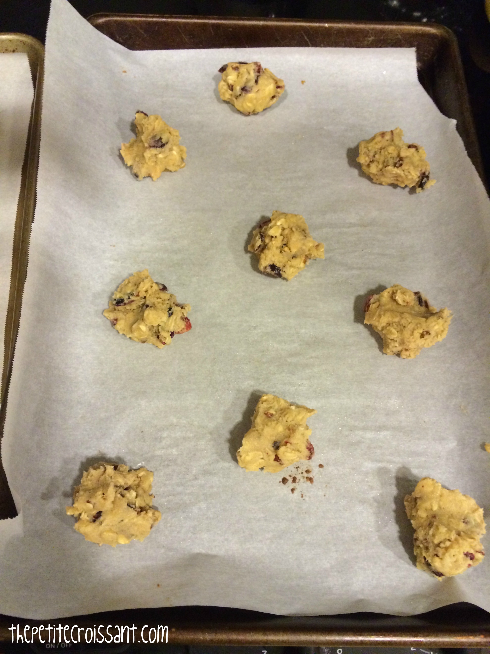 5. Divide the dough up into balls (a bit bigger than a tablespoon), and spread out on a baking sheet lined with wax paper or silicone liners.