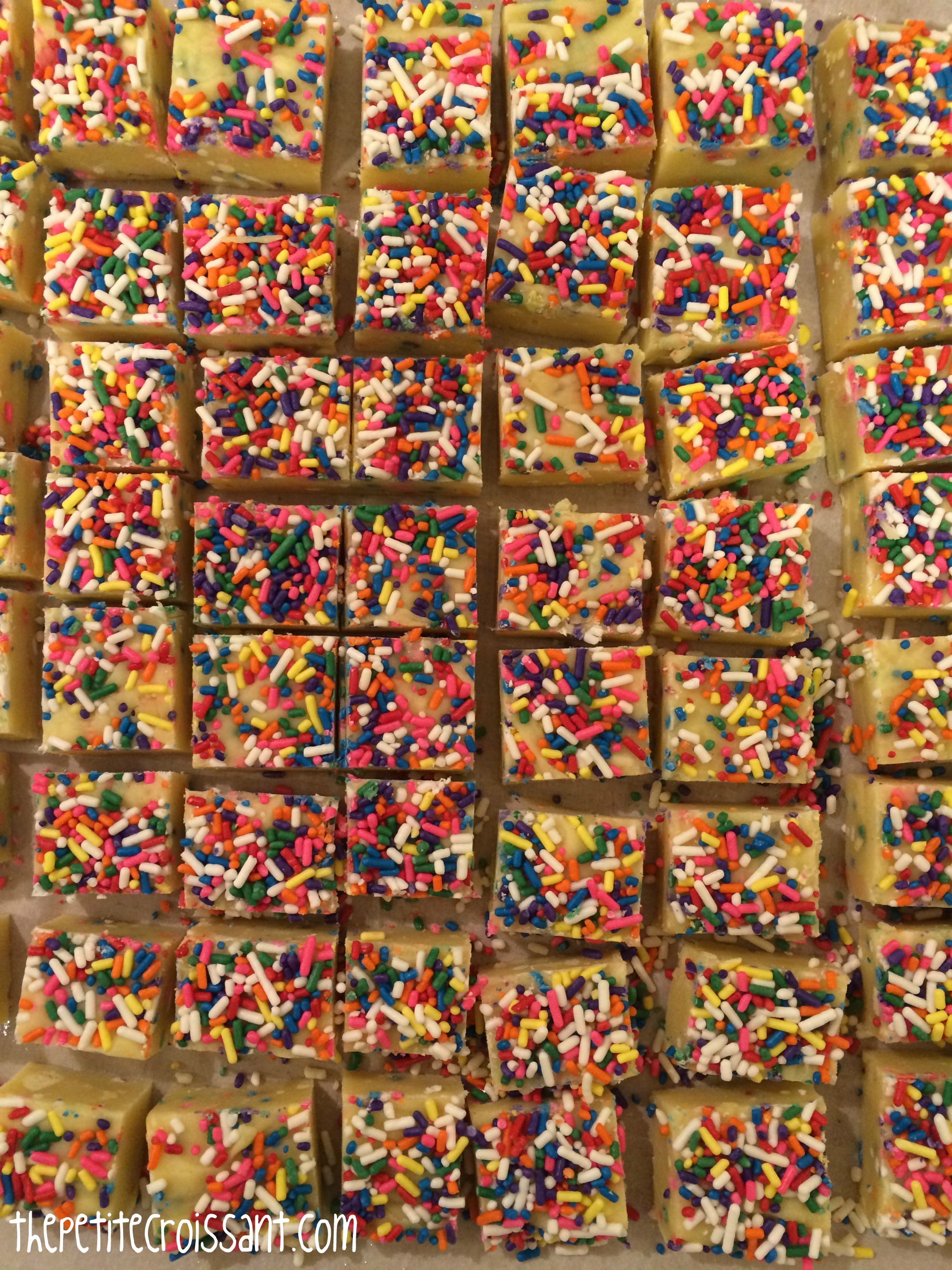 4. Pour the batter in a 8 by 8 pan lined with wax paper. Top with the rest of the sprinkles and use your hand to press them down so they stay put when you serve the fudge.