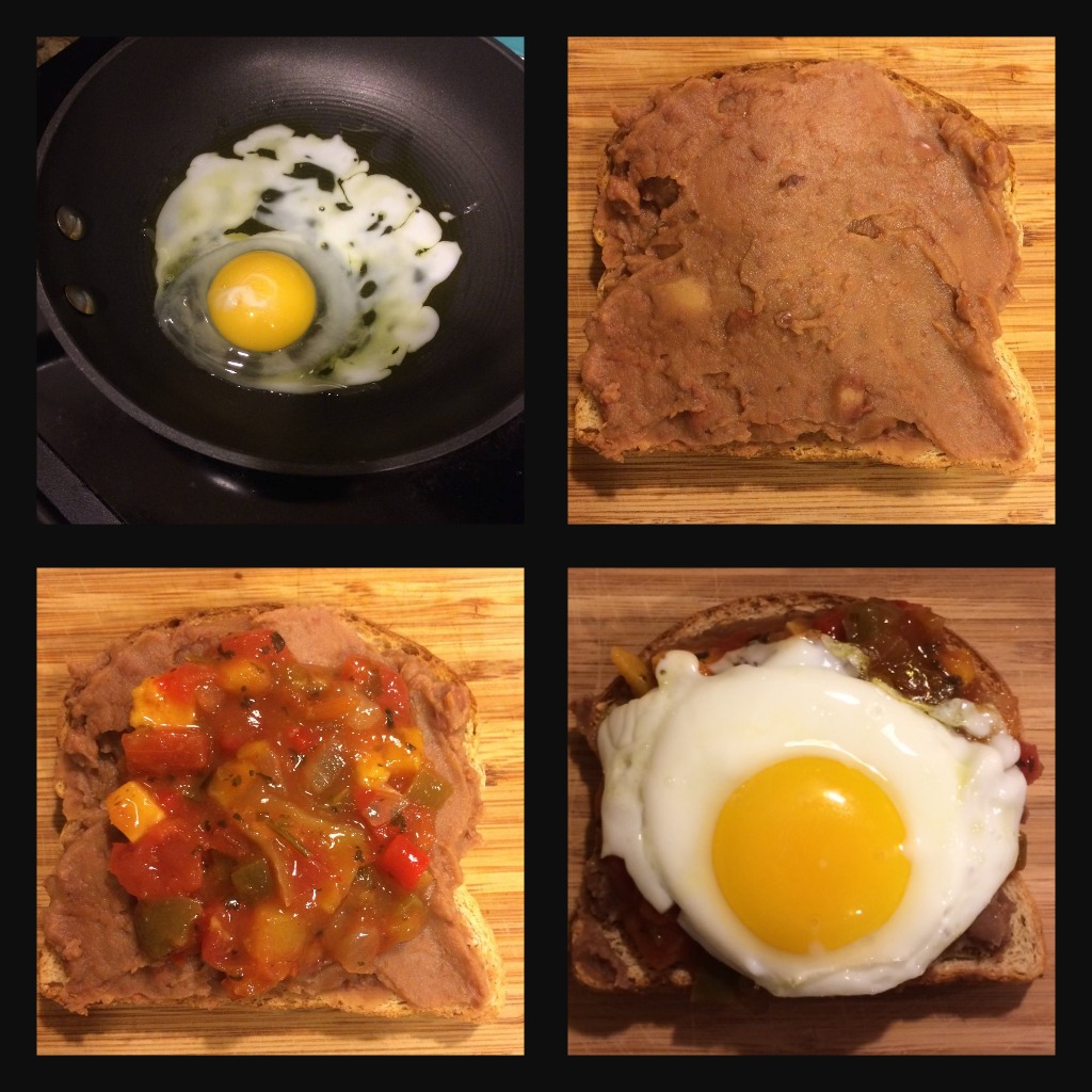 Dave’s favorite has been whole wheat toast covered in a layer of fat free refried beans, topped with a dollop of salsa, and finished with a fried egg.