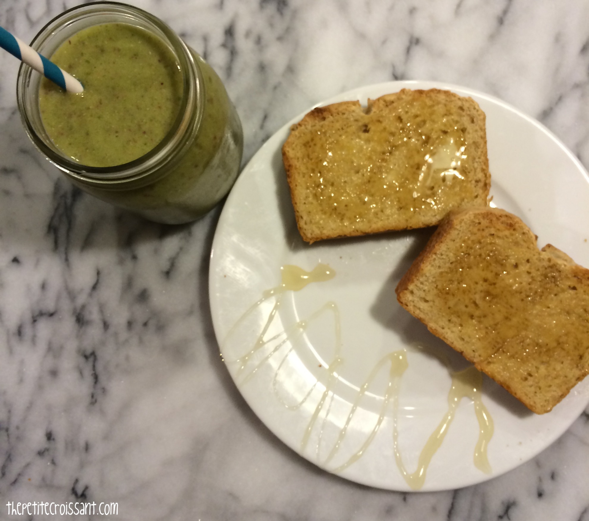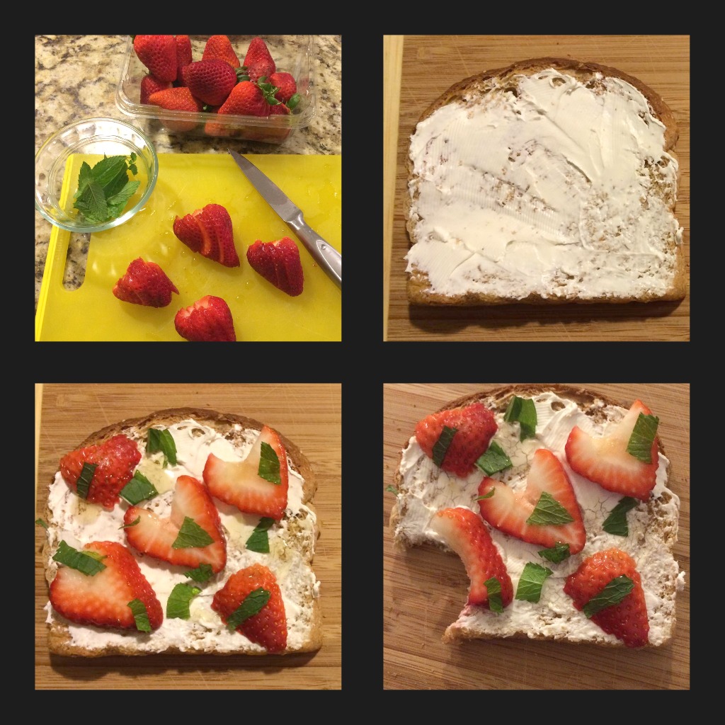 So I have a pretty strict morning ritual. A granola bar and a smoothie made with almond milk, banana, kale, chia seeds, lemon juice and zest, frozen mango and strawberries, and soy yogurt. However, this summer, I have a bit more time, so I decided it was time to spice up my morning ritual. I saw this article on BuzzFeed about all sorts of different interesting toasts you could make. My new favorite, which I’ve been eating the last few mornings, is whole wheat toast, smeared with fat free cream cheese, topped with sliced strawberries and chopped mint, and then finished with a drizzle of honey.