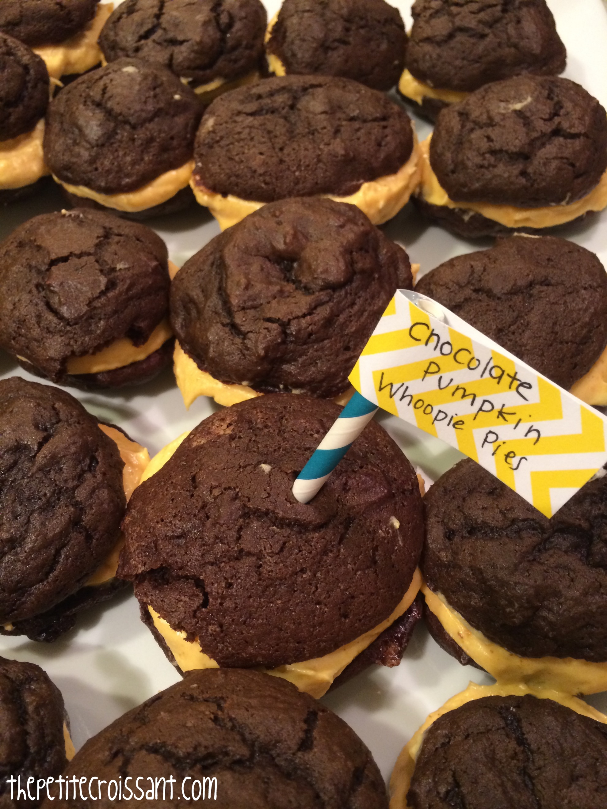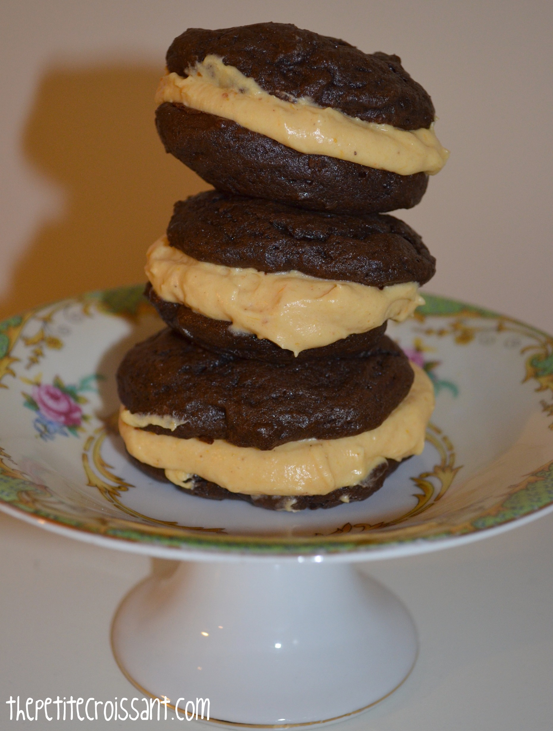 So here is the deal. Chocolate cookies are amazing by themselves. And so is cream cheese frosting. So why not put the two together and end with a delicious whoopie pie sandwich? I made these around Thanksgiving time so I did pumpkin cream cheese frosting, but you could substitute that in for a plain cream cheese frosting, or you could also make mint frosting to go with the chocolate.