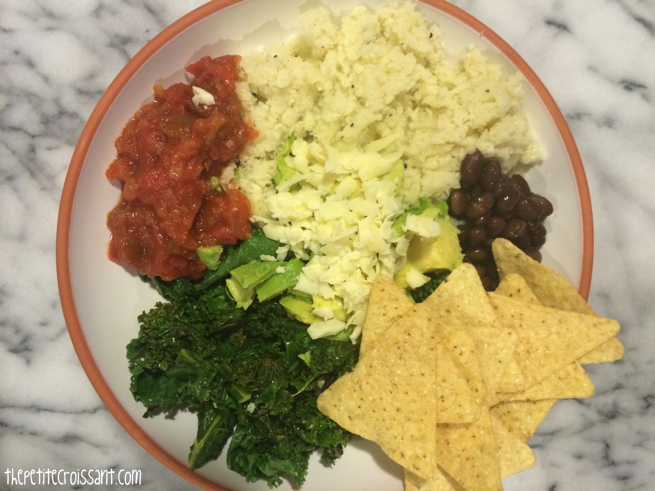 I eat Mexican food in every form. Literally, I live for anything with a bean, corn, salsa, guacamole combo. This is my latest iteration of a Mexican dish, and quite frankly, I think it is the healthiest version so far. The base is cauliflower rice, which is literally cauliflower and seasoning. I haven’t been keeping count, but I think we’ve made this dish once a week since I discovered the recipe in July.