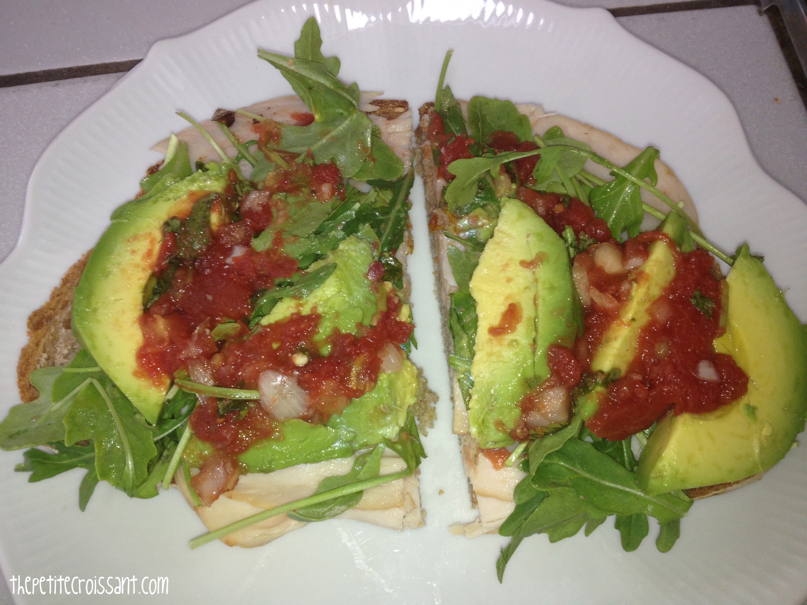 For lunch, I love something fast. On weekdays, I need something I can easily take with me to work/school, and on the weekends, I’m normally busy and grabbing lunch in between errands or after getting back from a workout class. It doesn’t get much easier than an open faced turkey sandwich. No really. Here I’ll prove it. Place a yummy piece of bread on a plate (I recommend some sort of artisan bread, not just your typical loaf of sandwich bread). Place a few pieces of turkey on top, followed by cheese if you want it, but not necessary. Top with a handful of arugula, a few spoonfuls of salsa and slices of avocado. And that’s it. Fresh, delicious, and took less than five minutes to prepare.